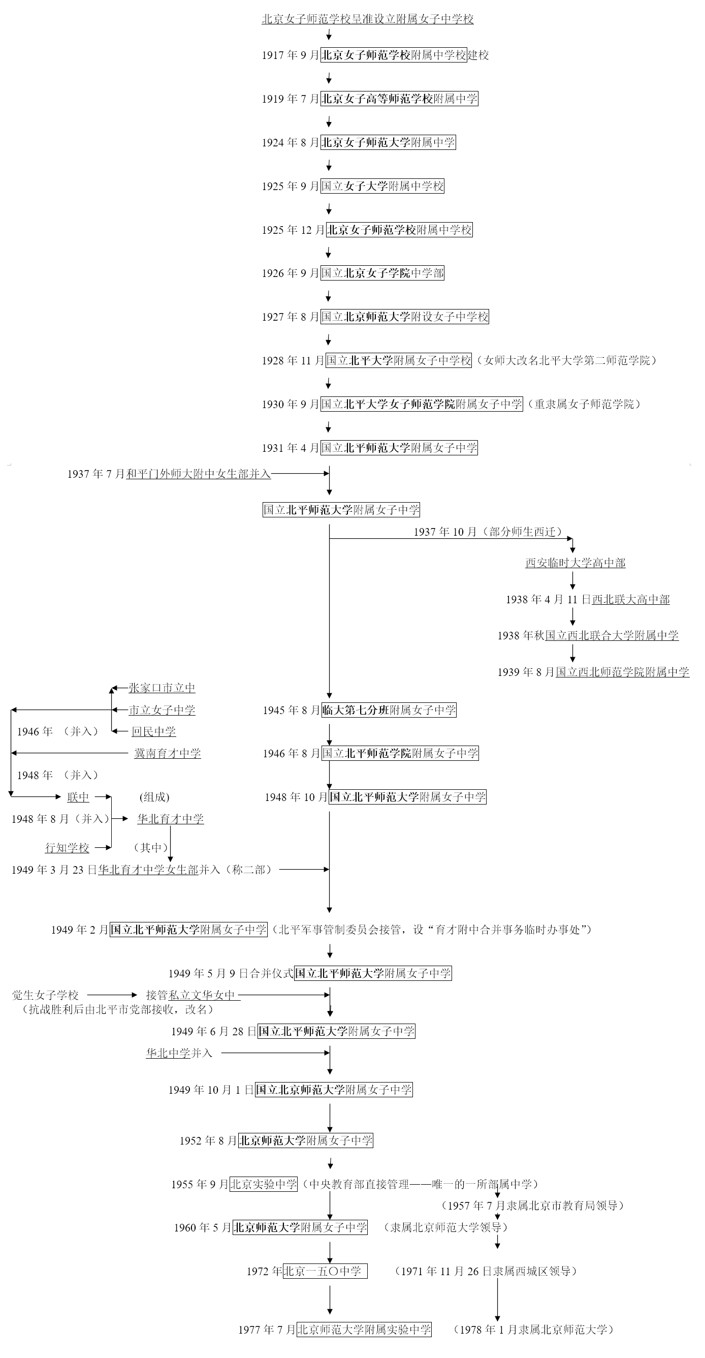 1917年9月5日,今北京师范大学附属实验中学的前身,“北京女子师范学校附属中学校”正式成立,学校主任欧阳晓澜率领教师数人,为79名学生举行了开学典礼。此前半年,即1917年3月,遵照时民国政府教育部《师范教育令》和《师范学校规程》,北京女子师范学校程准设立附属女子中学校。停招原师范预科,曾招国文专修科。这个时点,成为事实上今天北京师范大学附属实验中学悠久历史的发端。